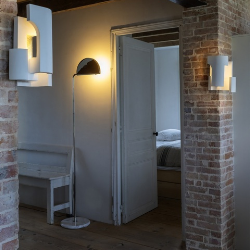 Fabriqué en acier, marbre, aluminium et acrylique, le Mezzaluna Floor conjugue robustesse et raffinement. Sa silhouette demi-lune reconnaissable en fait une pièce de collection autant qu’un luminaire de caractère, parfaite pour les salons, bureaux et espaces hôteliers en quête d’une présence forte et d’une lumière maîtrisée.